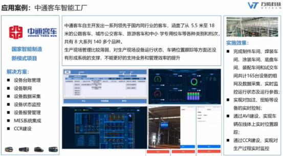 在中通客车,通过对165台设备和AVI车辆的监控,实现了全厂区的设备的连接,可以对整个生产过程实时监控。