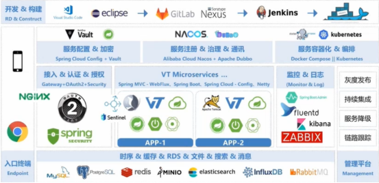 平台架构上一个是标准的微服务的架构。现在基于平台本身延伸出来各种各样的应用和解决方案,再去开发的时候