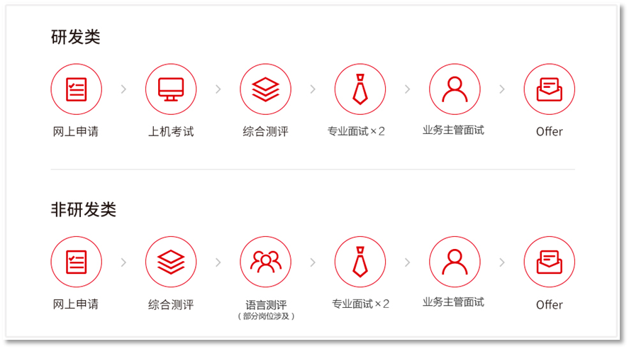 以华为的招聘为例,按照研发类和非研发类,面试流程可以分为: