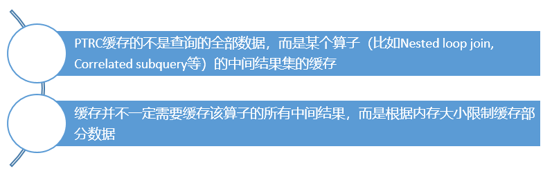 从这两点可以看出,PTRC是与单个查询相关的,生命周期从查询开始到查询结束,自动终止。由于它是对算子进行加速,所以一个查询内部可以有多个PTRC。只要优化器根据代价计算,认为该算子适合PTRC,那么优化器就会为该算子引入PTRC。