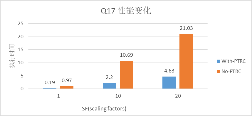 下面是我们使用TPCH的Q17来测试不同数据量下启用PTRC前后的性能变化。
