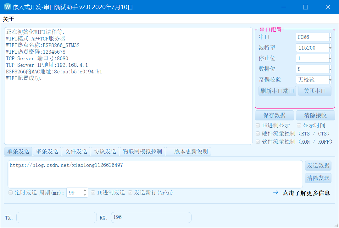 (4). WIFI采用正点原子的ESP8266模块,WIFI这边设置为AP模式,创建TCP服务器,手机端连接ESP8266的WIFI,打开手机APP连接WIFI创建的TCP服务器,接收WIFI发送过来的光强度进行实时显示。