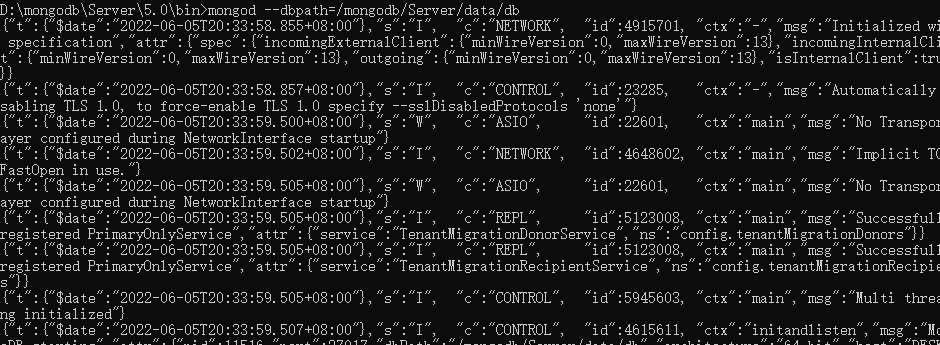 然后在之前的bin文件夹中,使用cmd打开面包,输入mongod --dbpath=/mongodb/Server/data/db
