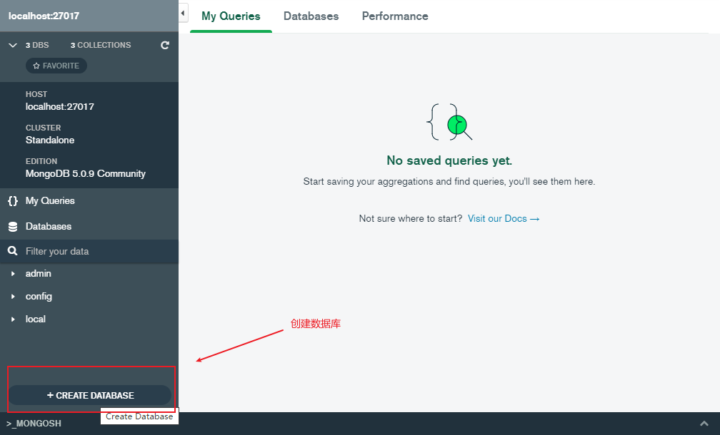 连接成功后,点击界面左下角的加号+, 可以创建数据库