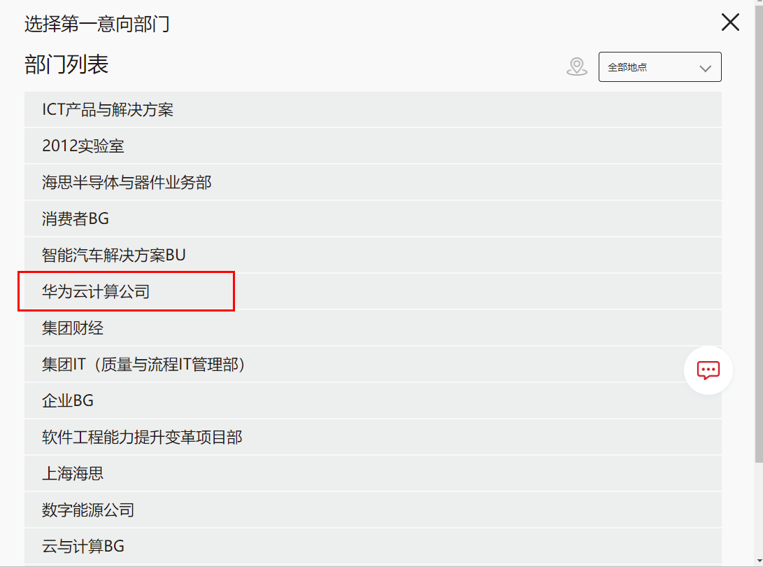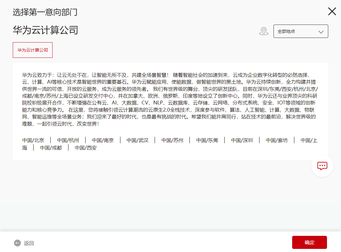 第四小步:往下滑,第一意向部门,选择华为云计算公司