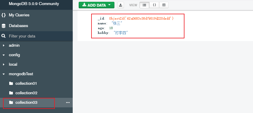 // 使用之前手动创建的mongodbTest数据库