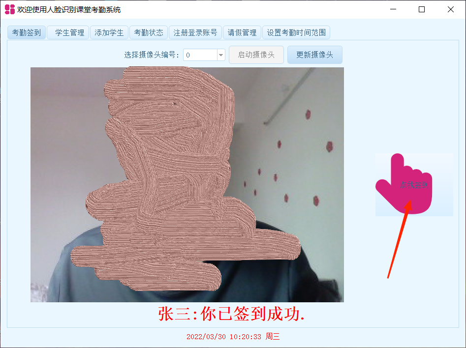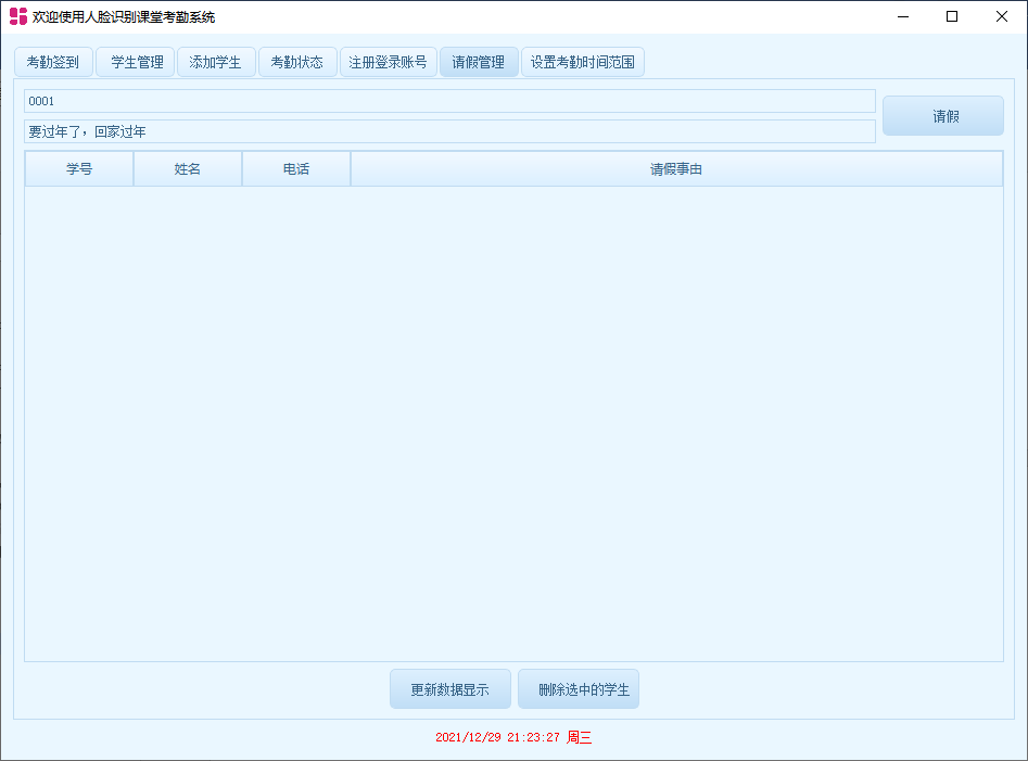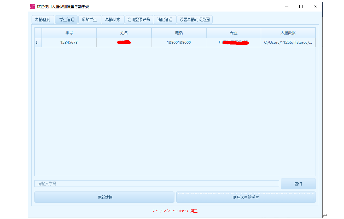 软件主要是应用在高校给学生进行考勤、签到处理,所有在功能上需要健全,支持人脸签到,支持输入学号签到,支持添加学生,支持删除学生;在界面上也支持请假管理,需要请假的学生在界面上录入请假事由,方便上课老师了解该学生的详细情况;在录入学生信息的同时,输入了学生的学号、电话、姓名、专业等信息,在学生迟到没有上课的时候,老师可以通过电话进行联系,了解情况。以前高校考勤都是老师点名实现记录的,这样比较浪费课堂时间,有了这套支持人脸识别的系统,学生路过的时候就直接进行考勤签到,非常方便,也不需要学生进行拿笔进行纸质签到,提高了整体的课堂效率。
