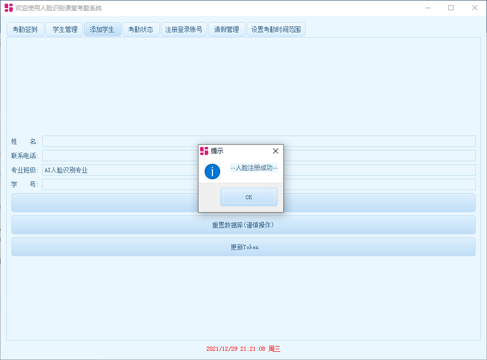 在考勤状态页面可以看到当前已经签到的学生信息,在添加学生的页面可以添加新的学生,添加学生时需要将人脸对着摄像头然后输入信息进行添加,软件运行过程中需要连接网络,如果添加成功会有弹窗进行提示,添加的学生信息存放在数据库里保存的,在飞桨的云端数据库里保存了人脸数据;学生信息添加成功之后,在学生管理页面就可以看到添加的学生信息,然后就能正常的考勤识别了。