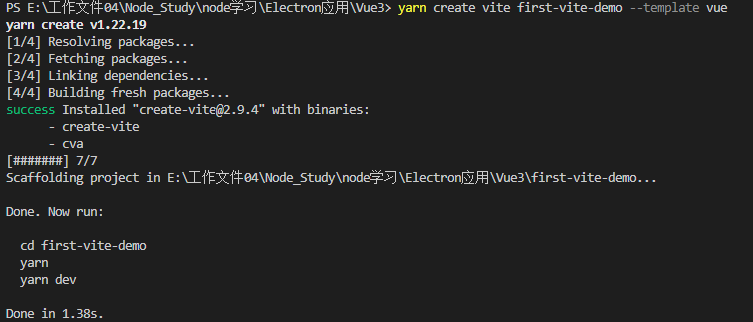 先在vs code中打开终端,使用yarn创建一个vite项目: yarn create vite first-vite-demo --template vue