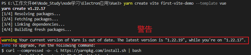 我这里遇到了一个警告和一个错误,警告是yarn版本过低了,错误是