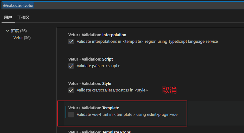 将里面的Template勾选取消,然后重启vs code,这样重新打开App.vue就不会出现红色波浪线了