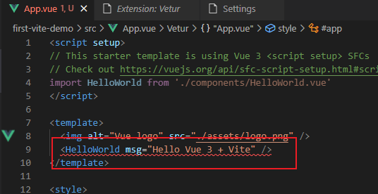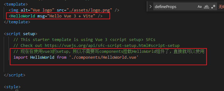 在Vue3中,使用vite创建的示例里,App.vue中引入使用HelloWorld组件,并没有写components包括,这是因为使用了setup