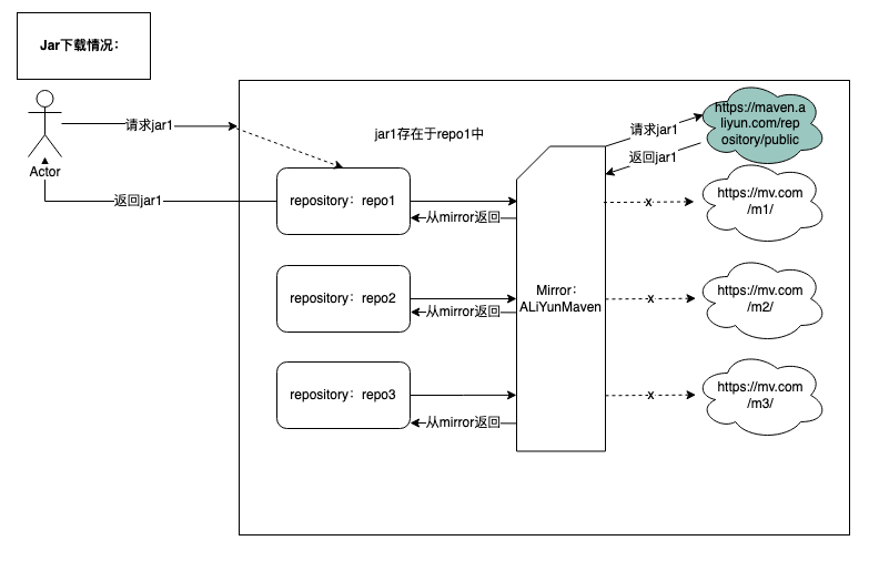 mirror仅仅是作为指定仓库的一个加速网站,一般是一个网速快,依赖多的网站,所以也是允许不使用mirror的,如果使用的都是自己公司内部依赖源。可以直接只使用repository。这样,他会依次从每个仓库检索,顺序也是从上到下。