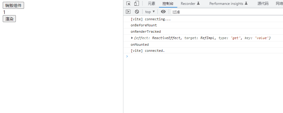 在实例中可以看到,最初渲染中,onBeforeMount > onRenderTracked > onMounted,然后修改val数值,页面重新渲染触发onRenderTriggered > onBeforeUpdate > onUpdated。