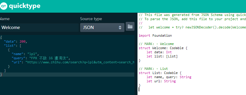 我选择了全局安装: npm install -g quicktype, 如果图方便,可以直接使用网页https://app.quicktype.io/来进行生成