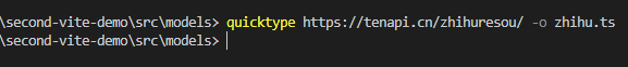 全局安装完成后,在vs code终端中打开要生成ts接口类型文件的对应models文件夹,然后输入命令:quicktype 接口地址 -o 文件名称.ts