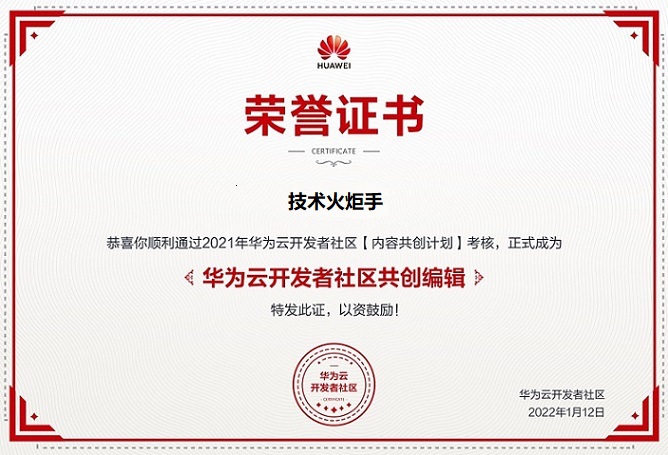 ☞官方认证:本年度内获得5篇满分文章(且本年度内不得有1分文章)即可签约华为云作者,成为华为云的特约编辑,并发放电子荣誉证书。