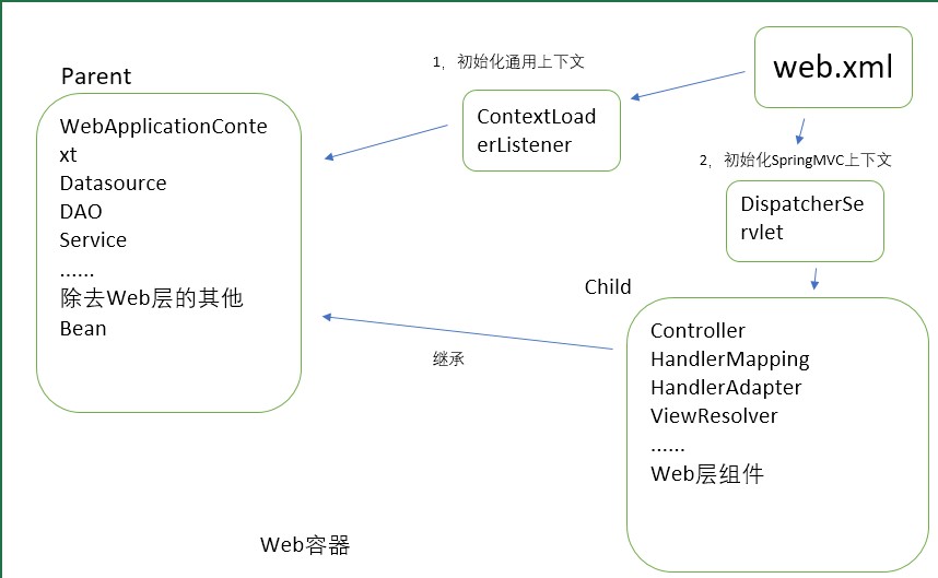 - DispatcherServlet初始化的上下文加载的Bean是只对Spring Web MVC有效的Bean,如Controller、HandlerMapping、HandlerAdapter等等,该初始化上下文应该只加载Web相关组件。