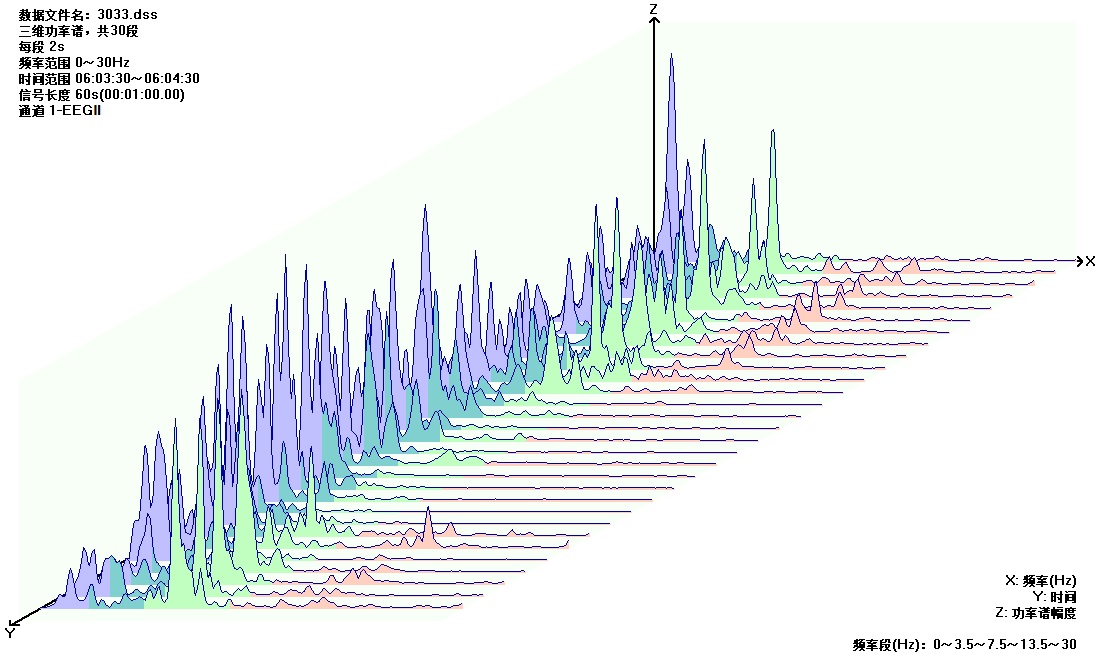 趋势图中显示段数据动态谱估计。在选定的趋势图通道中点击鼠标右键弹出菜单,选择《三维功率谱》菜单项,要求用户输入每个分段的长度,确认之后计算动态谱。