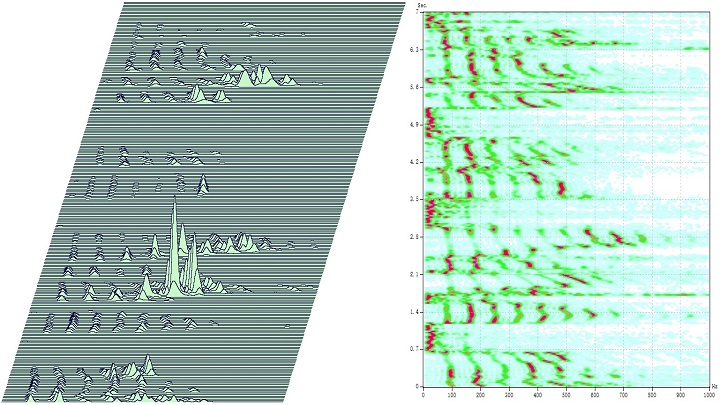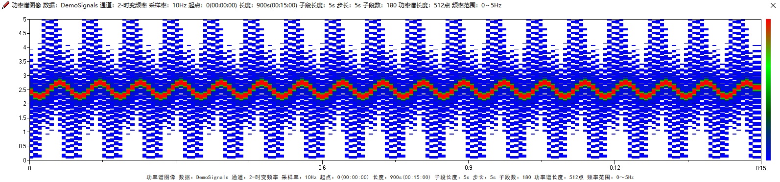 时变功率谱(谱图)通常用三维图形显示,x轴代表频率,y轴代表时间,z轴代表功率;也可以用图像显示,x轴代表频率,y轴代表时间,颜色表示功率。