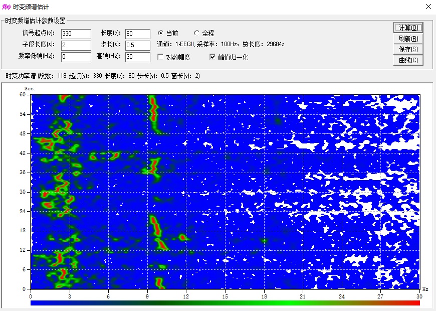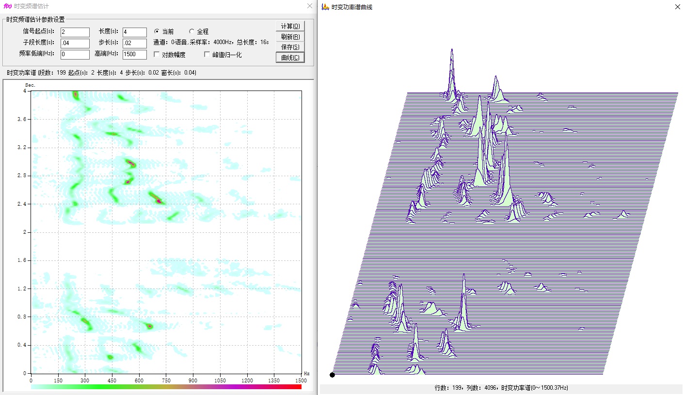 菜单操作:在信号波形显示框外左边或者右边点击鼠标右键弹出菜单,选择其中《时变功率谱图像》,要求用户输入分段长度和移动步长,对当前显示段信号进行动态谱估计,其结果用图像形式显示。