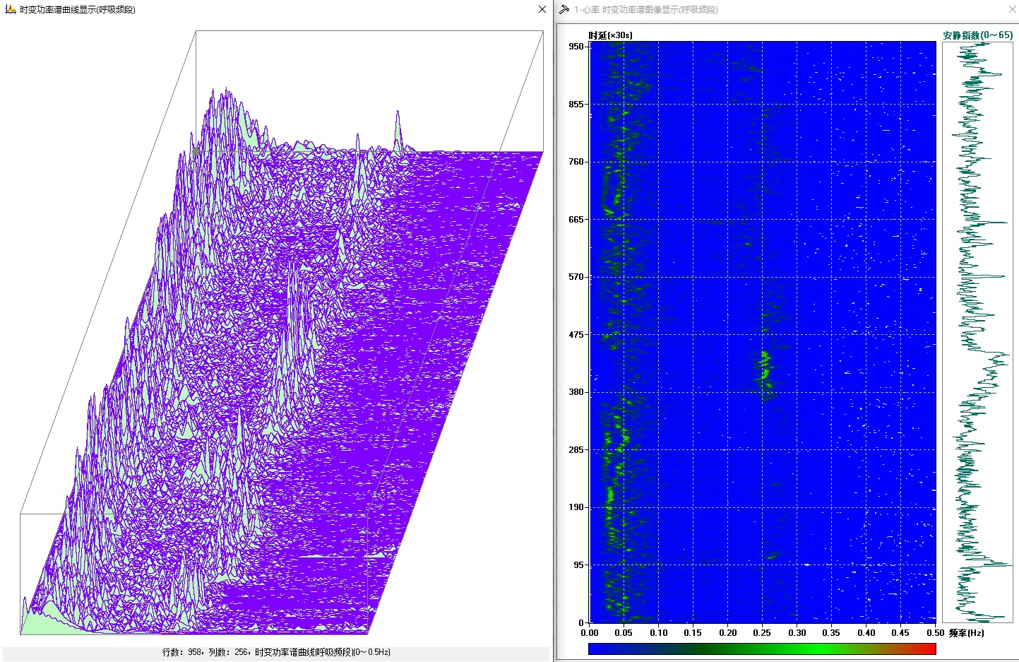 如果趋势图中存在心率或者心动周期通道,则可以对心动周期(或者心率)在呼吸频率段进行动态谱估计,计算是针对整个心率(或心动周期)趋势全程进行的。操作:在趋势图中,选中心率通道(ch=1)或者心动周期通道(ch=2),在趋势图波形中点击鼠标右键,弹出菜单,选择其中菜单项:《心率与心动周期》→ 《时变功率谱(呼吸频率段)》,出现如下动态谱图形,左边是三维图形表示的心率功率谱随时间的变化,右边是图像形式显示的心率功率谱随时间的变化情况,最右边是呼吸在心率中的调制程度曲线,对应着个体的安静程度。