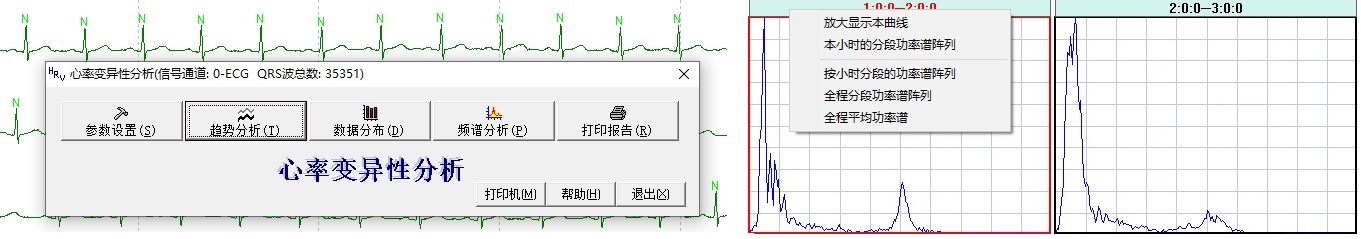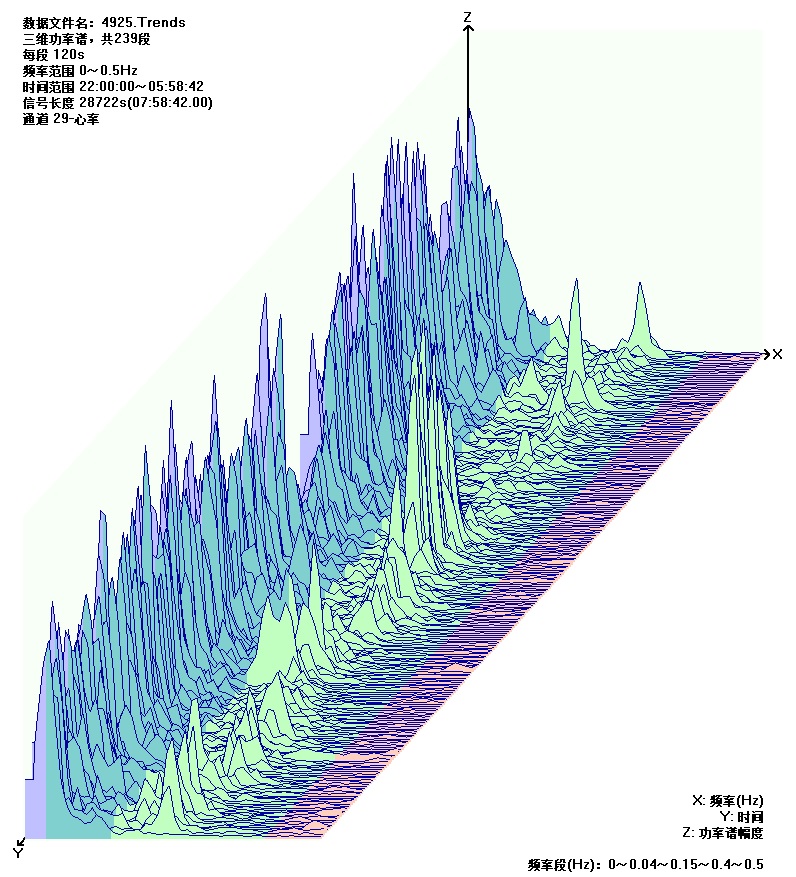 心率变异性(HRV)频谱分析中,每5分钟一段的心率动态功率谱三维显示曲线。选定心电通道或者脉搏波通道,且在该通道上存在波峰检测结果,那么就可以进行心率变异性分析。菜单操作:《分析》→ 《心率变异性分析》→ 《HRV分析》。出现如下对话框,点击其中“频谱分析”按钮,出现按每小时一段的功率谱曲线。鼠标右键点击每条功率谱曲线上顶部时间段标识(淡蓝色),弹出菜单,选择《全程分段功率谱阵列》菜单项,计算并显示每5分钟一段的动态功率谱图形。