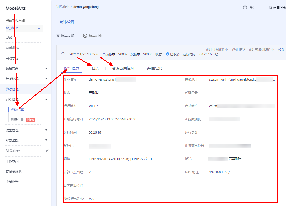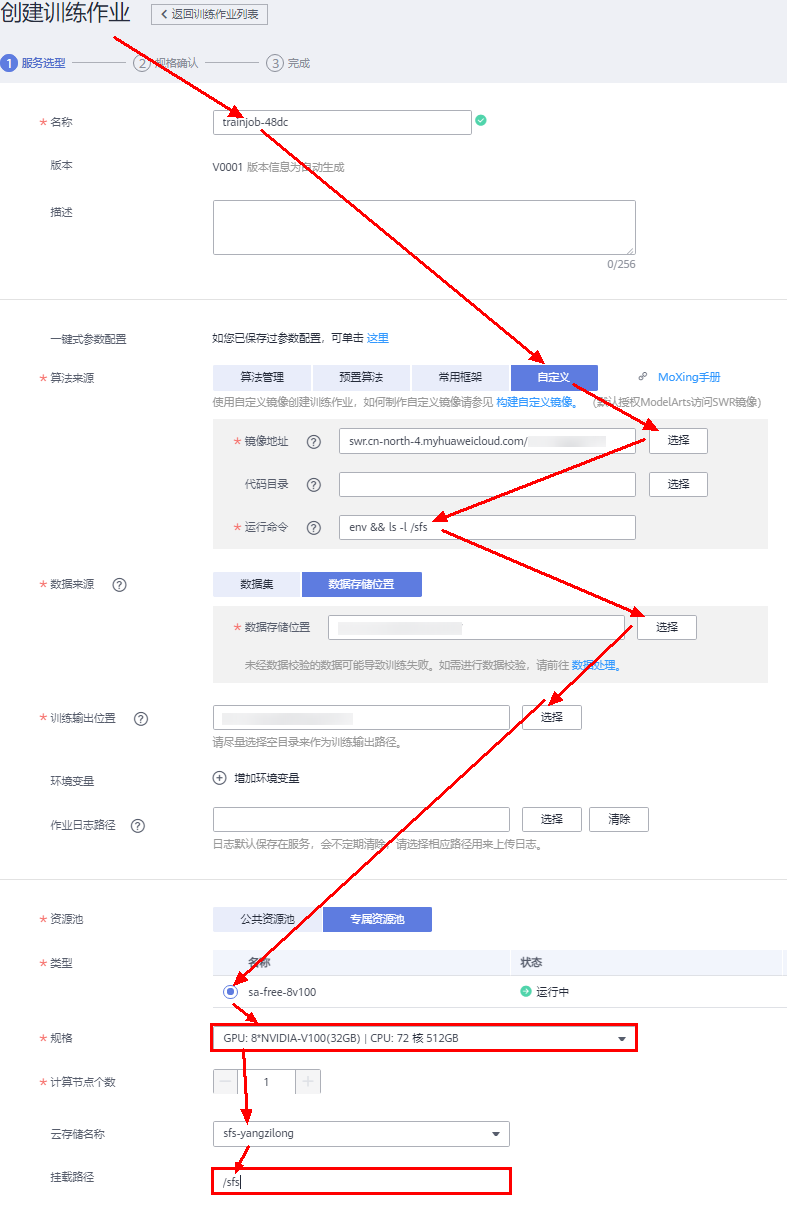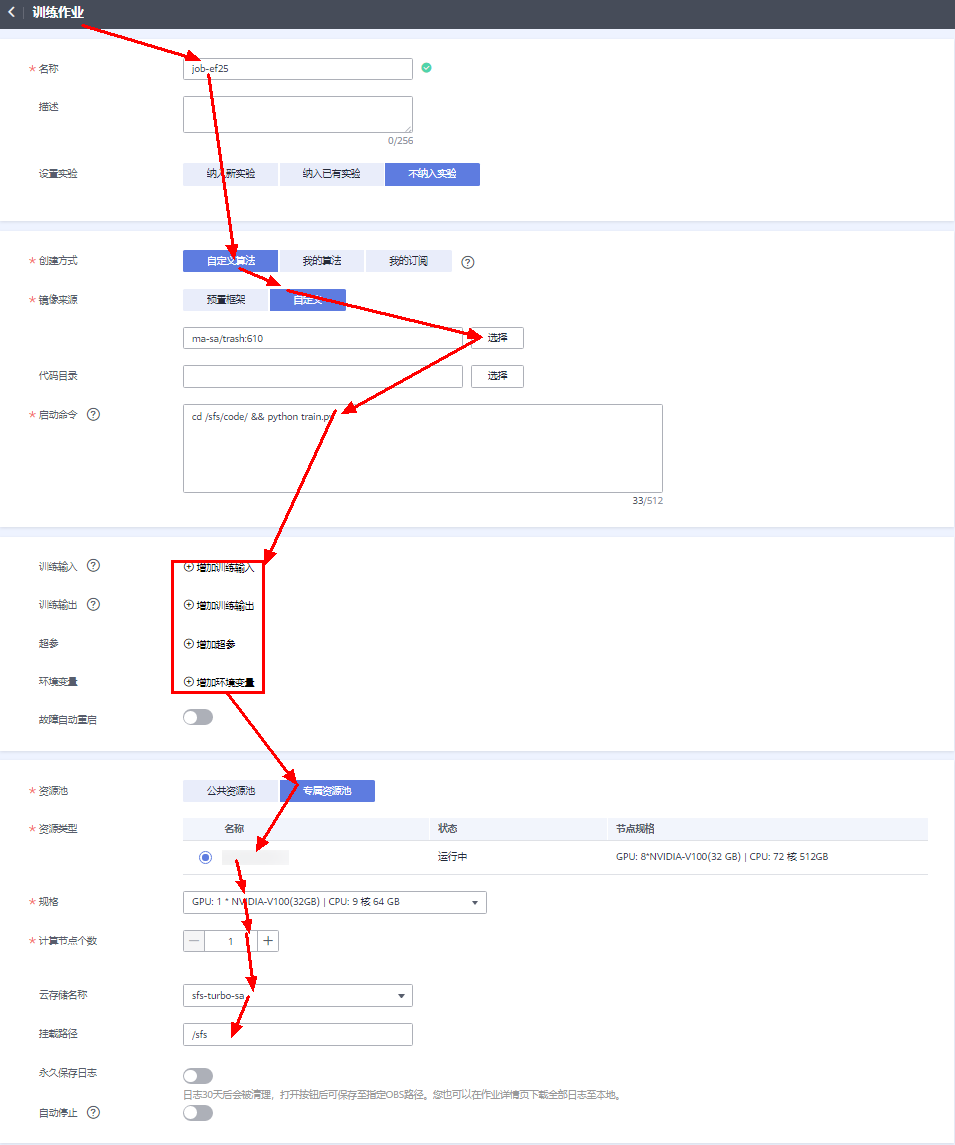 配置训练作业参数,重点关注:镜像id,启动命令,资源规格,挂载路径。其中挂载路径需要和启动命令匹配。
