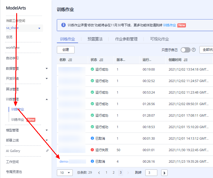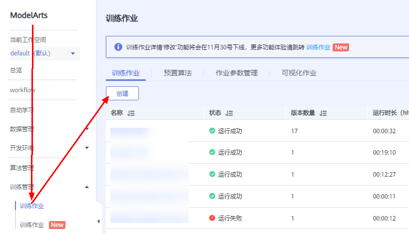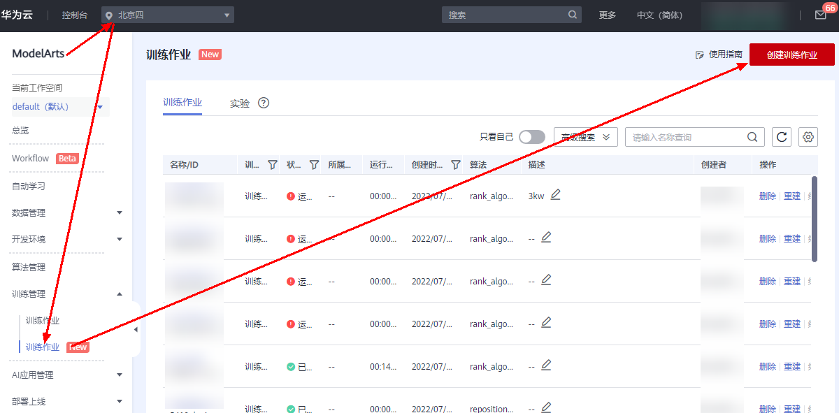 进入ModelArts服务,并选定region。北京四链接如: https://console.huaweicloud.cn/modelarts/?region=cn-north-4#/trainingJobs