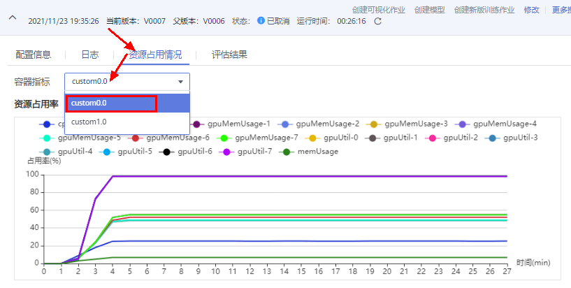 在“日志”、“资源占用情况”子页签分别查看日志信息和各节点的CPU、GPU利用率。多子节点时可以手动切换,界面如截图: