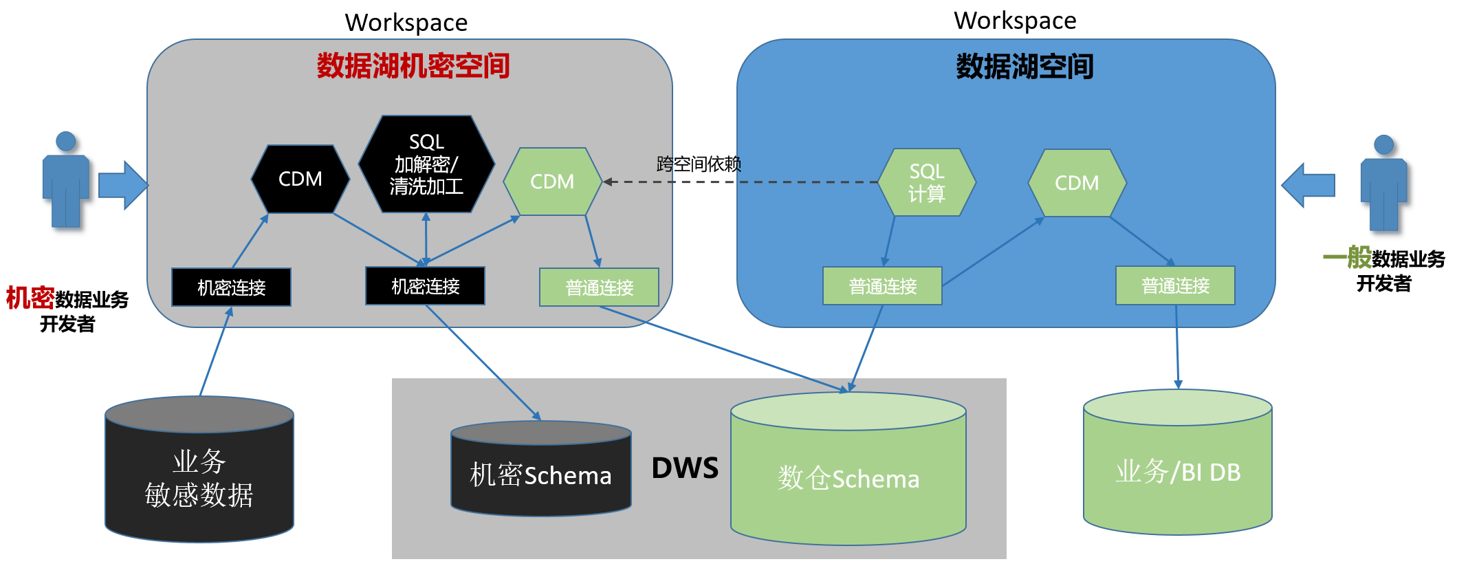2、DGC上创建独立的机密空间,该空间内配置敏感业务数据库连接、有权限访问DWS机密Schema的连接(该连接账号通常也需要有普通Schema的访问权限,方便机密数据做关联分析)。由于在DGC的workspace内,一般开发者角色都可以无差别使用数据源连接来访问数据,并且都可以修改和执行脚本和作业,因此,该workspace内的成员必须都是可以访问机密数据的机要人员。
