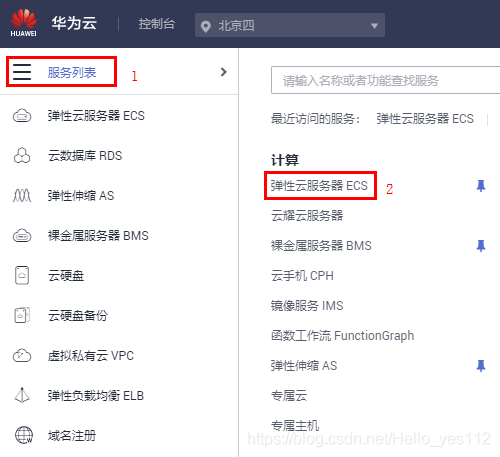 如下图所示,进入控制台后,选择 “弹性云服务器ECS”。