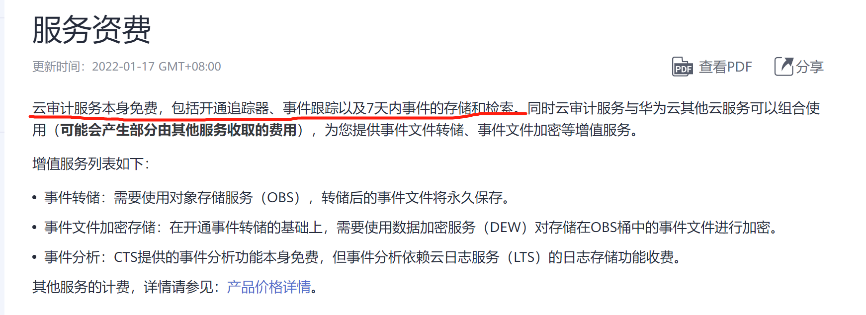 云审计服务CTS是一项付费服务,付费项目包括开通追踪器、事件跟踪以及7天内事件的存储和检索等相关费用