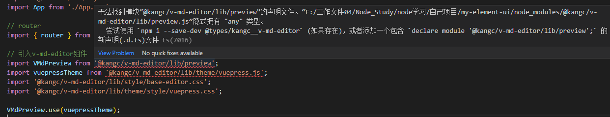 我尝试了一下安装@types/kangc__v-md-editor,不过失败了。那么解决方案只能在main.ts的同级目录中的vite-env.d.ts中添加declare module声明,这样就不会有报错了。