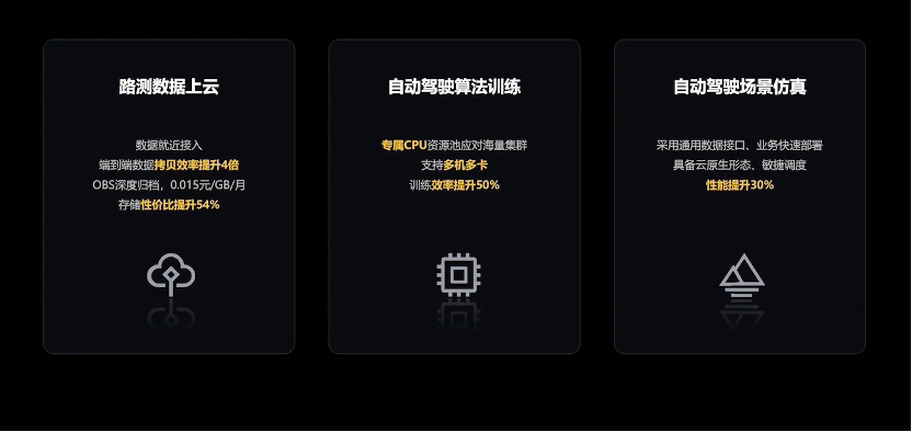 华为云自动驾驶研发平台解决方案主要服务于三个场景,首先是自动驾驶路测数据上云,我们为合作伙伴就近提供了介入站点,拷贝速度提升4倍,自动驾驶算法提升50%,性能提升了30%。