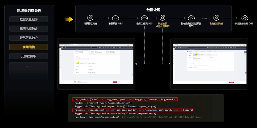 将我们的业务处理模块基于华为云的容器进行部署,然后再修改下面红色框中的两行代码,将OBS数据和业务处理流数据进行关联,即可完成自动化的部署和调度。这样OBS数据新增以后,自动处理业务处理单元,然后将结果输出到新的OBS中。这样就可以实现全流程的自动化触发。