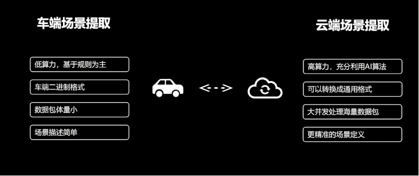 场景的提取可以在车端或者云端,在车端的场景提取会受限于一些先决条件,比如车端的算力比较低,基于规则开发的一些算法,一般会把场景存成二进制的格式和小体量的数据包,这样可以简单描述场景。