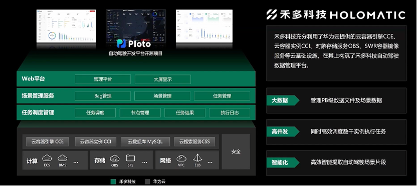 与华为云的合作,充分利用了华为云提供的云容器引擎CCE、云容器实例CCI、对象存储服务OBS、SWR容器镜像服务等云基础设施。下图左侧则为禾多科技实现的功能,包括Web平台、场景管理服务和任务调度管理等。