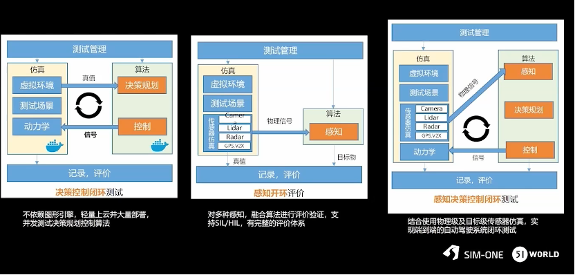 SimOne总共有三种测试模式,包括决策控制闭环、感知开环和感知决策控制闭环测试模型。