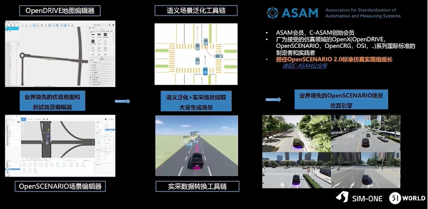 场景编辑这块,SimOne提供了OpenDRIVE地图编辑器以及OpenSCENARIO场景编辑器。场景生成通过语义场景泛化工具链和实采数据转换工具链来生成场景。使用的引擎也是业界领先的OpenSCENARIO场景仿真引擎。