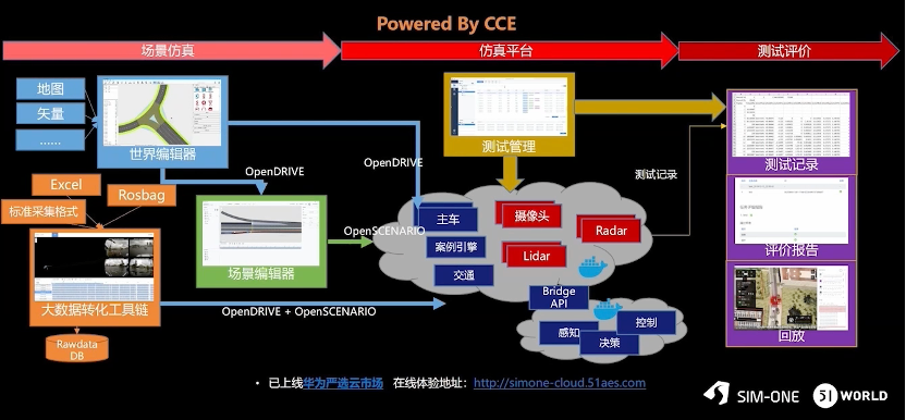 下面是SimOne基于华为云的整个场景流程,包括场景仿真,到仿真平台,再到测试评价整个完整流程,将整个架构的内容串了起来。场景仿真这块,我们可以通过世界编辑器生产高精地图,通过场景编辑器生成OpenScenario场景,同时也可以通过大数据生成大量的数据放在场景中。