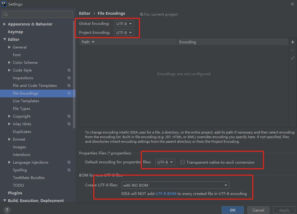 如果想自定义错误提示信息的话,首先先修改IDEA的编码配置,File->Settings->Editor->File Encodings,修改为UTF-8。