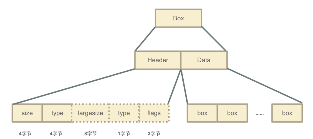- MP4 文件由许多 Box(由唯一的标志符和长度限定的面向对象的结构块,在某些规格中被称为atom,一个Box中可以包含另一个Box) 和 FullBox。