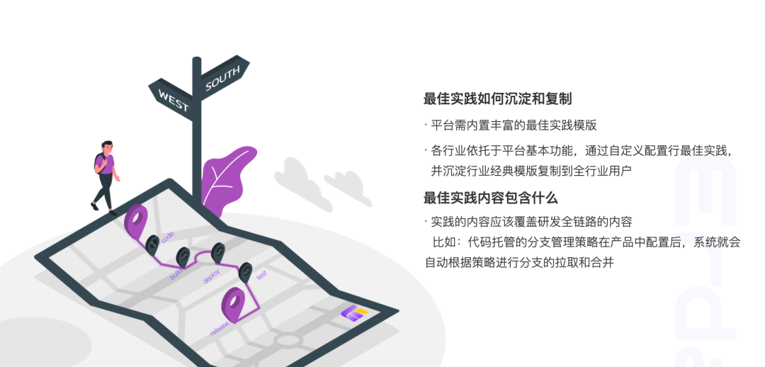 想通过一种产品形态去支撑覆盖所有的行业是不现实的,一个 DevOps 平台研发团队,不可能深入了解熟悉各行各业的研发模式,更不可能去定义实践去引领所有行业的研发提效。平台能做和需要做的是:把平台底层基础能力做强、做灵活,让不同业领导者,在高效持续交付的理论引导下,利用平台丰富的基础能力和高度自定义配置能力,去构建属于自己行业的研发实践模式,最终通过行业研发实践模式沉淀模版的可复制化,助力该行业整体研发效能的提升。
