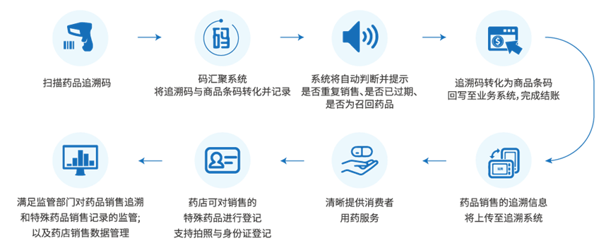 “医码平川”具有追溯码和商品条码转化功能,零售药店扫描药品追溯码完成结账的同时,利用追溯码所含有效期、批次、用药辅导等详细信息即可自动判断并提示是否重复销售、是否已过期、是否为召回药品等,有效保障了民众用药安全。