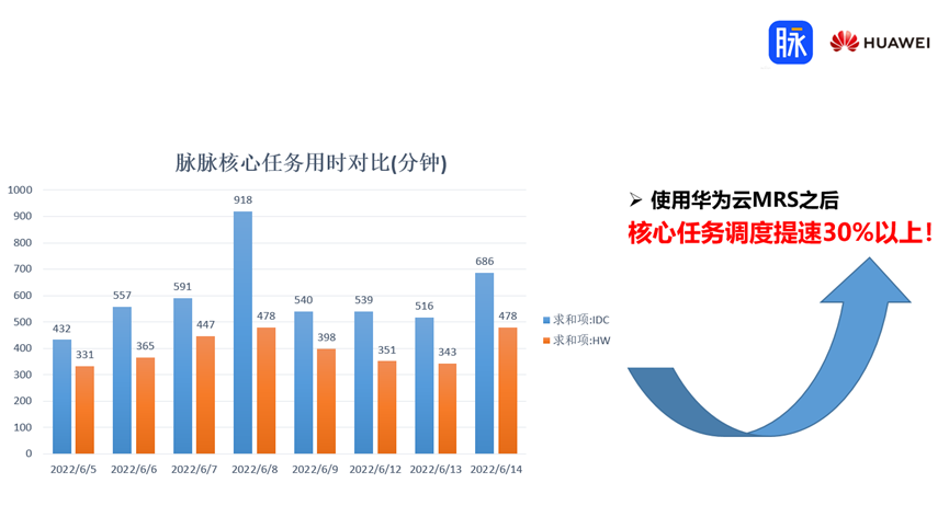 基于华为云大数据服务MRS,脉脉实现了业务平滑迁移上云。实现计算和存储资源完全解耦,资源扩容更快,任务调度更智能,运维更便捷,且核心任务调度性能提速 30%以上!