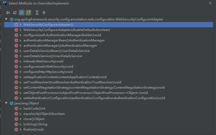 只要继承了WebSecurityConfigurerAdapter抽象类并且加上Spring的配置注解@Configuration以及将Bean放到容器中管理的 @EnableWebSecurity注解和@EnableGlobalMethodSecurity(prePostEnabled=true)就可以完成一个Spring Security的配置类的创建,实现全局生效自定义的安全配置。在创建完成后,可以重载里面很多设置配置的方法,如下图所示: