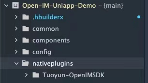 将下载下来的Tuoyun-OpenIMSDK文件夹整个放入uniapp项目根目录下的nativeplugins文件夹下(若没有该文件夹则新建)。