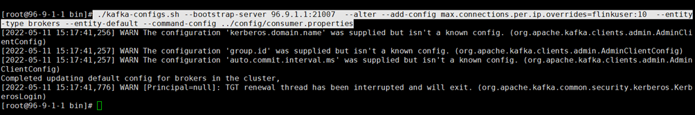 ./kafka-configs.sh --bootstrap-server kafkaip:21007 --alter --add-config max.connections.per.ip.overrides=flinkuser:10 --entity-type brokers --entity-default --command-config ../config/consumer.properties