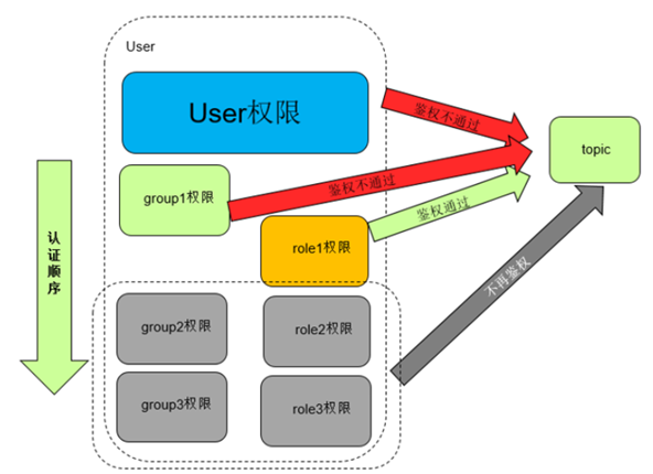 ⑤旧版本的鉴权使用了kafka.security.auth.SimpleAclAuthorizer 的鉴权方式。鉴权的顺序是按照: 用户-用户组-角色的顺序进行鉴权,假设在鉴权过程中,用户和用户组没有权限但是角色有权限,那么在kafka的鉴权过程中会出现“用户鉴权失败-用户组鉴权失败-角色鉴权成功”这样的流程。